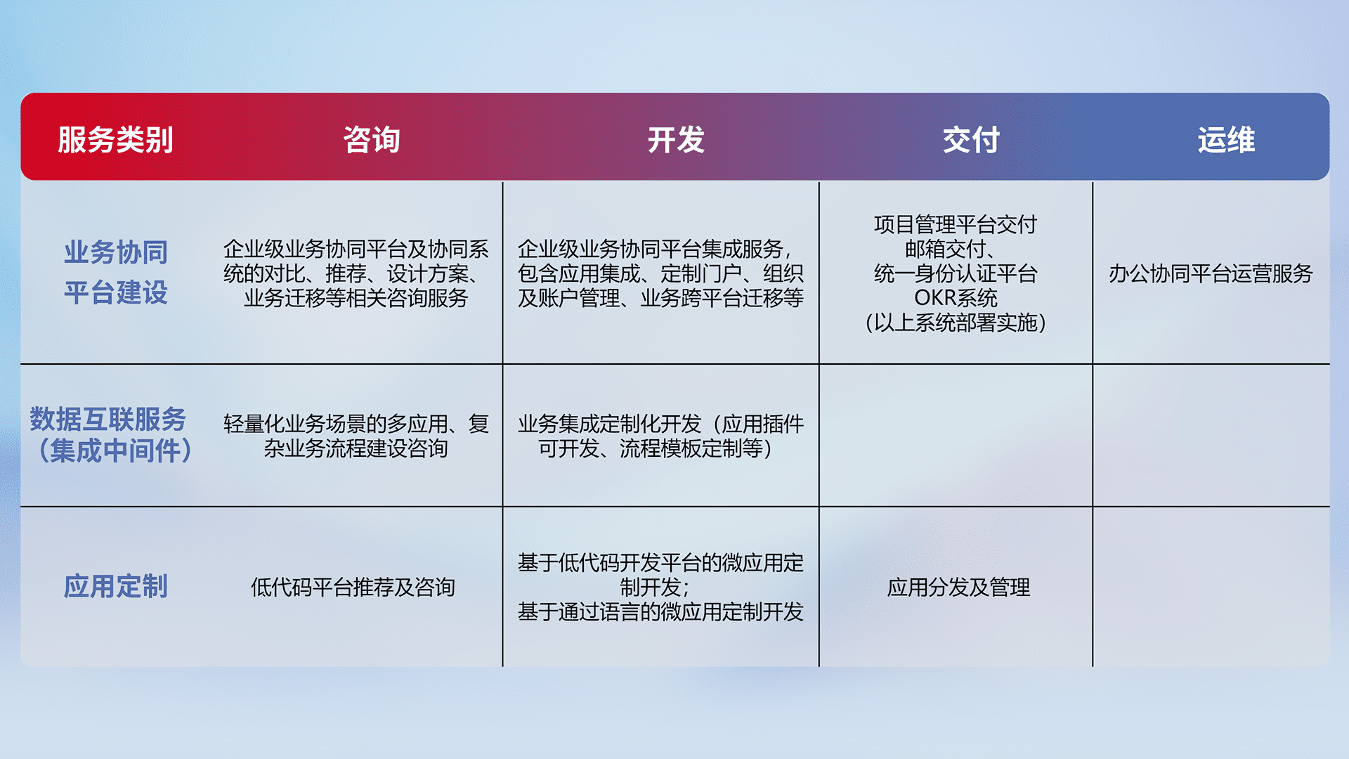 针对钉钉、、、企微、、、IDaas等平台级产品提供产品的规划、、、方案、、交付、、定制化开发等服务,,,实现如统一协同办公、、智能客户服务、、、、混合会议管理、、、智能数据查询、、、、等业务场景,,,实现数字化转型。。。。